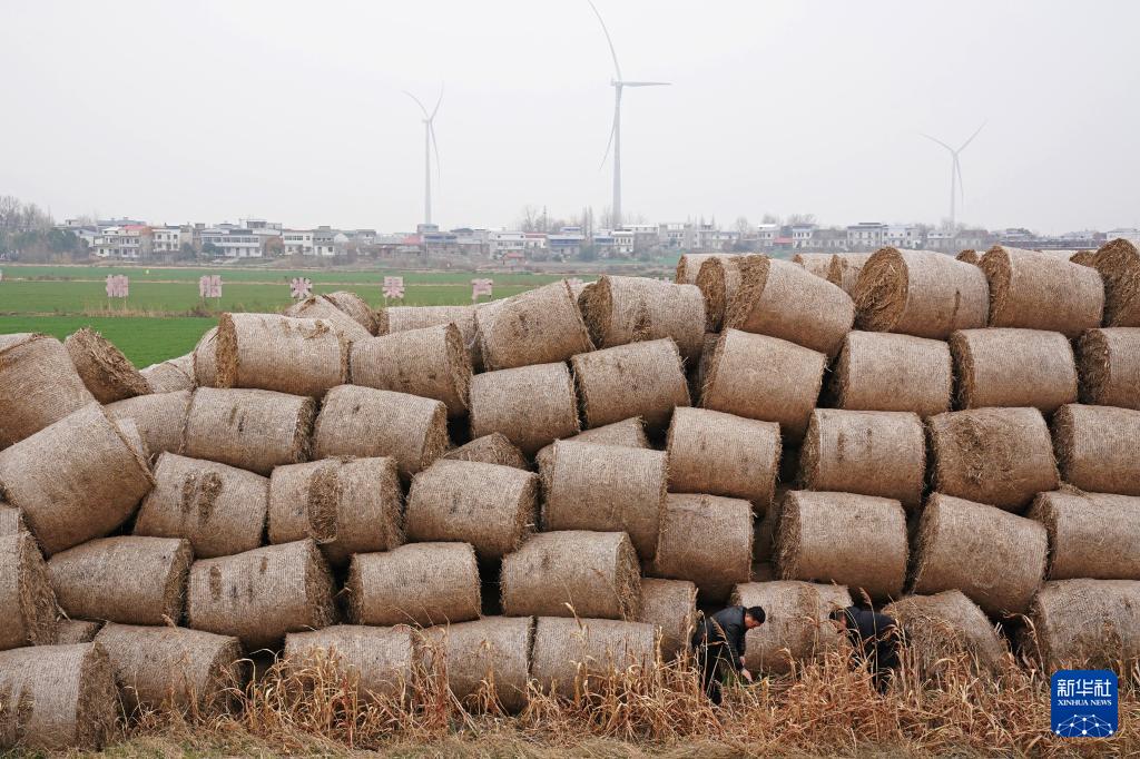 在位于长江江西段的棉船岛上,工人清理回收的秸秆准备运送至岛外循环利用(2026年1月29日摄)。