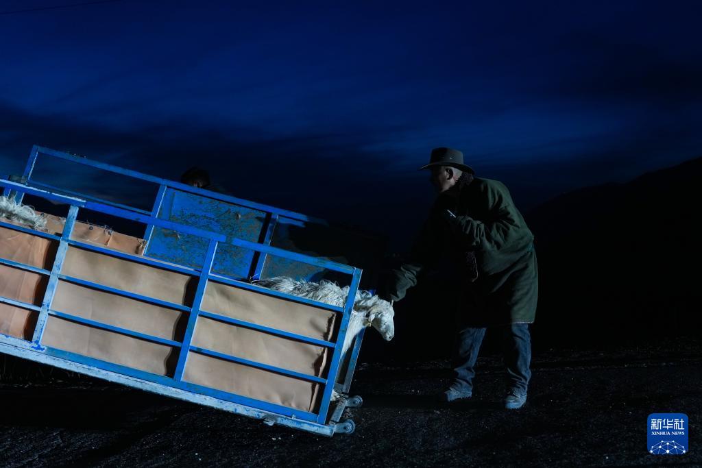 3月7日,在青海省海北藏族自治州祁连县阿柔乡草大板村,东宝将车辆中的羊群放归草原。