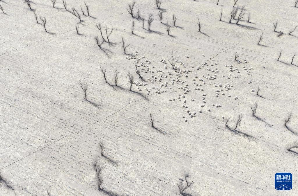 3月7日,在甘肃省张掖市甘州区碱滩镇二坝村的借牧点,羊群在玉米秸秆地中觅食(无人机照片)。