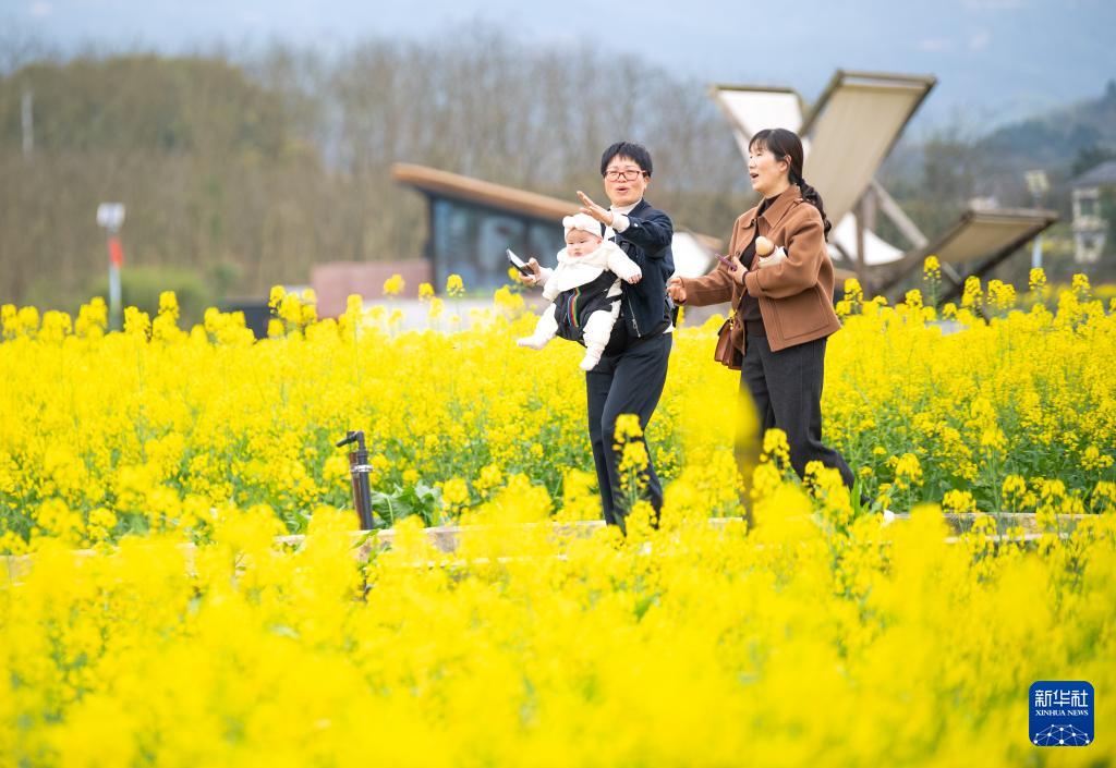 3月9日,游客在油菜花田游玩。