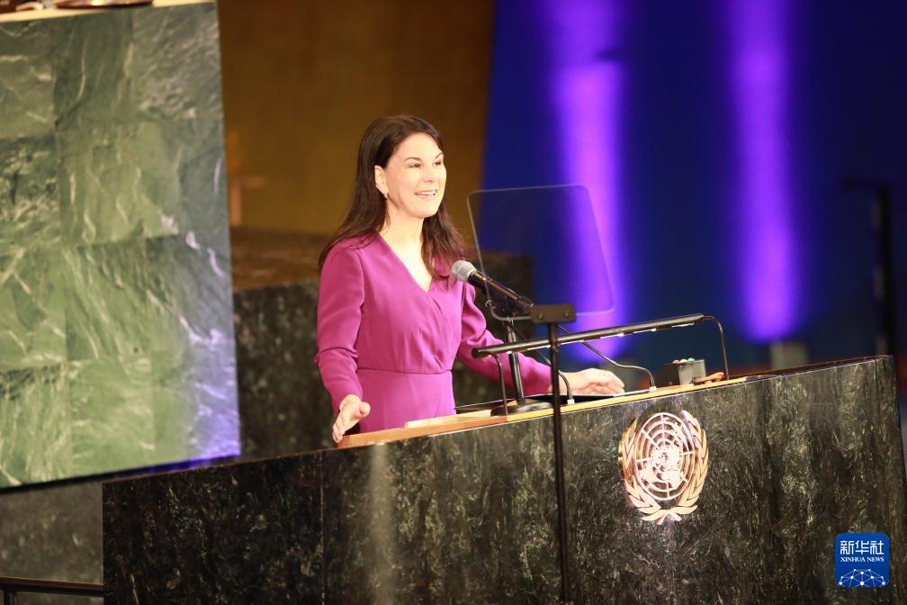 3月9日,在位于纽约的联合国总部,第80届联合国大会主席贝尔伯克在庆祝“三八”国际妇女节活动上发言。