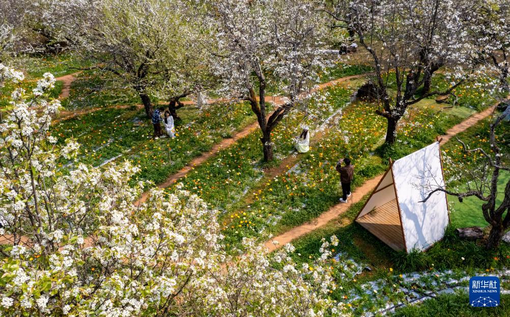 3月10日,游客在昆明名花谷拍照打卡(无人机照片)。