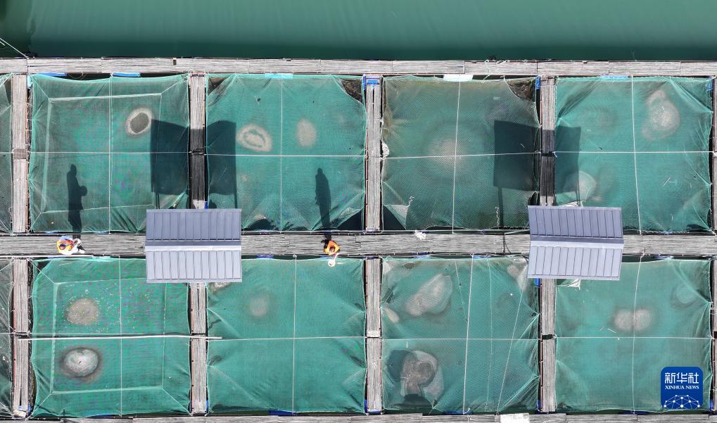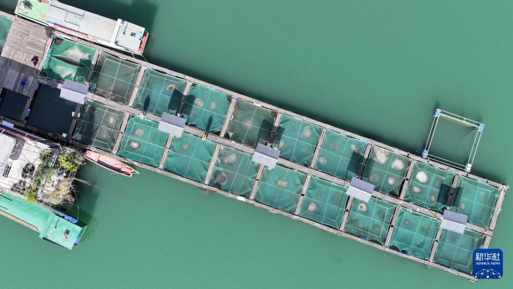 3月9日,重庆市万州区水产研究所大周基地工作人员在给鱼类喂食(无人机照片)。