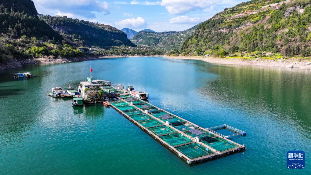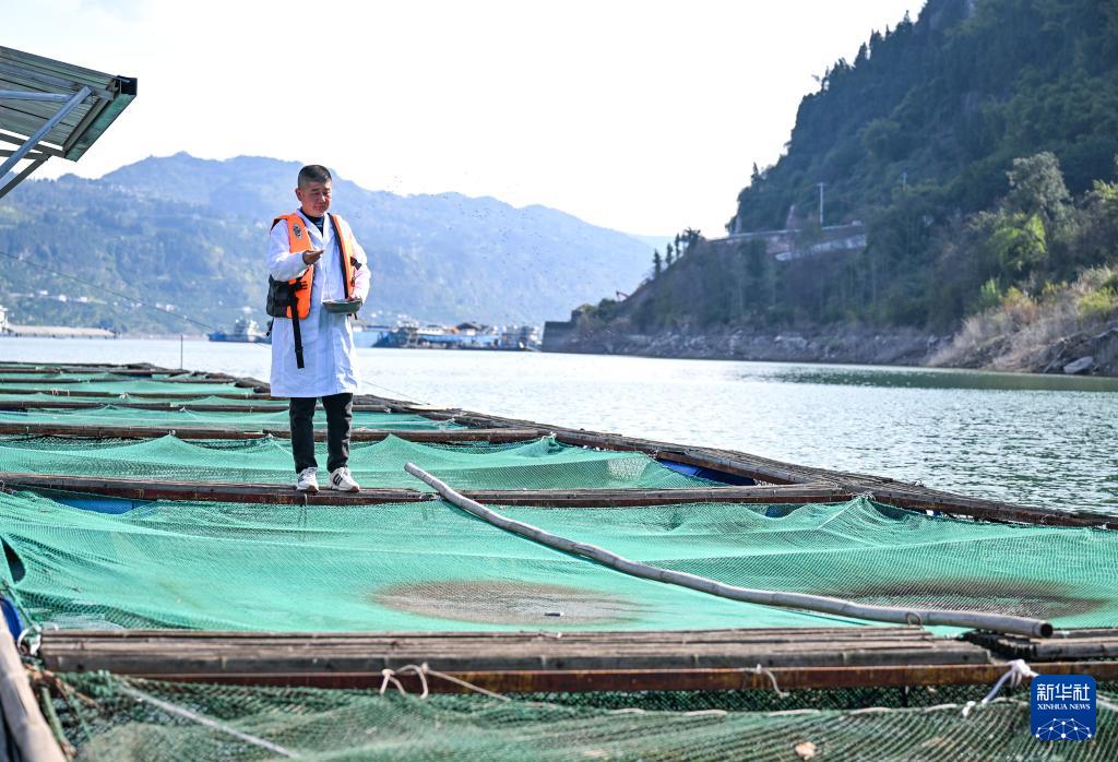 3月9日,重庆市万州区水产研究所大周基地工作人员在查看网箱内的鱼类生长情况。