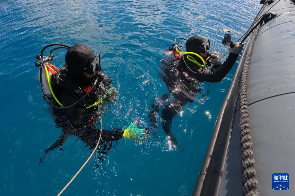 3月1日,海警三都舰执法员在南海某海域组织潜水训练。