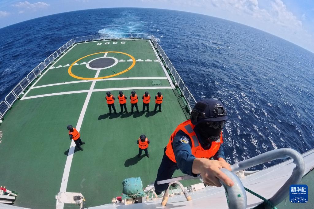 茫茫南海,壮阔浩渺,深蓝色的海水拍打着海警舰艇。连日来,海警三都舰编队在我国南海某海域执行巡航值守任务,维护祖国海洋权益。中国海警执法员开展常态巡逻执法、组织日常训练、管理服务过往船舶等工作。