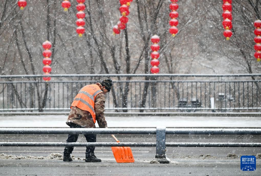 3月11日,环卫公司工作人员在新疆乌鲁木齐市西大桥上清理积雪。