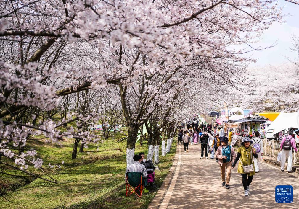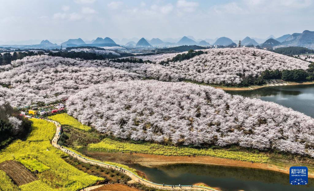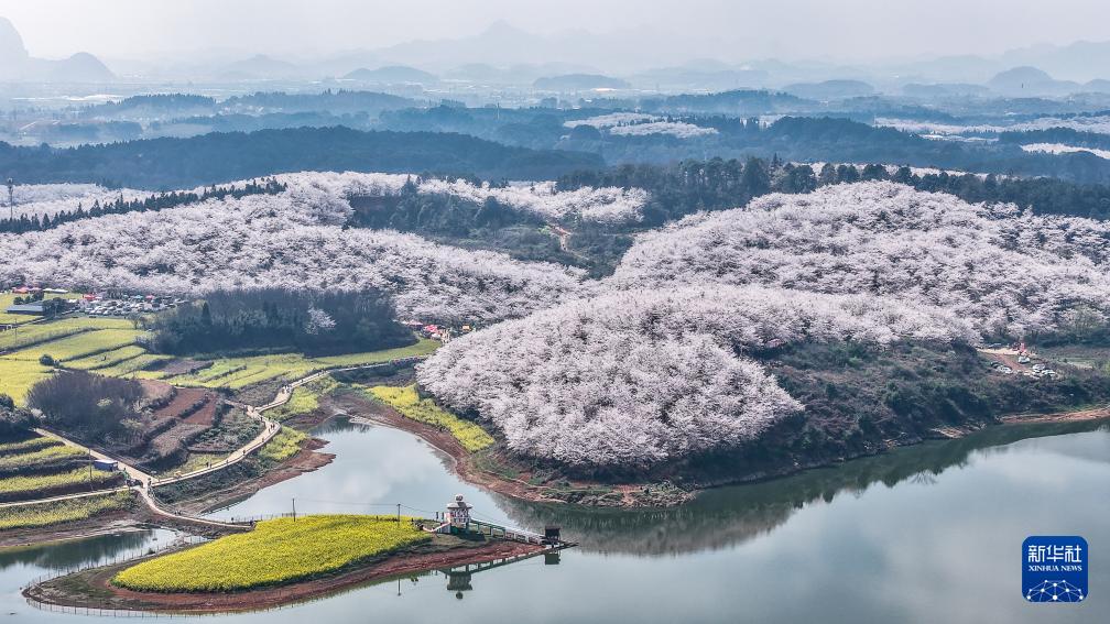 近日,随着气温回升,贵州省贵安新区樱花园内的2.4万亩樱花迎来盛花期。如云似霞的樱花和山川、湖泊、民居构成一幅幅美丽的春日画卷,吸引众多游客前来观光游玩。