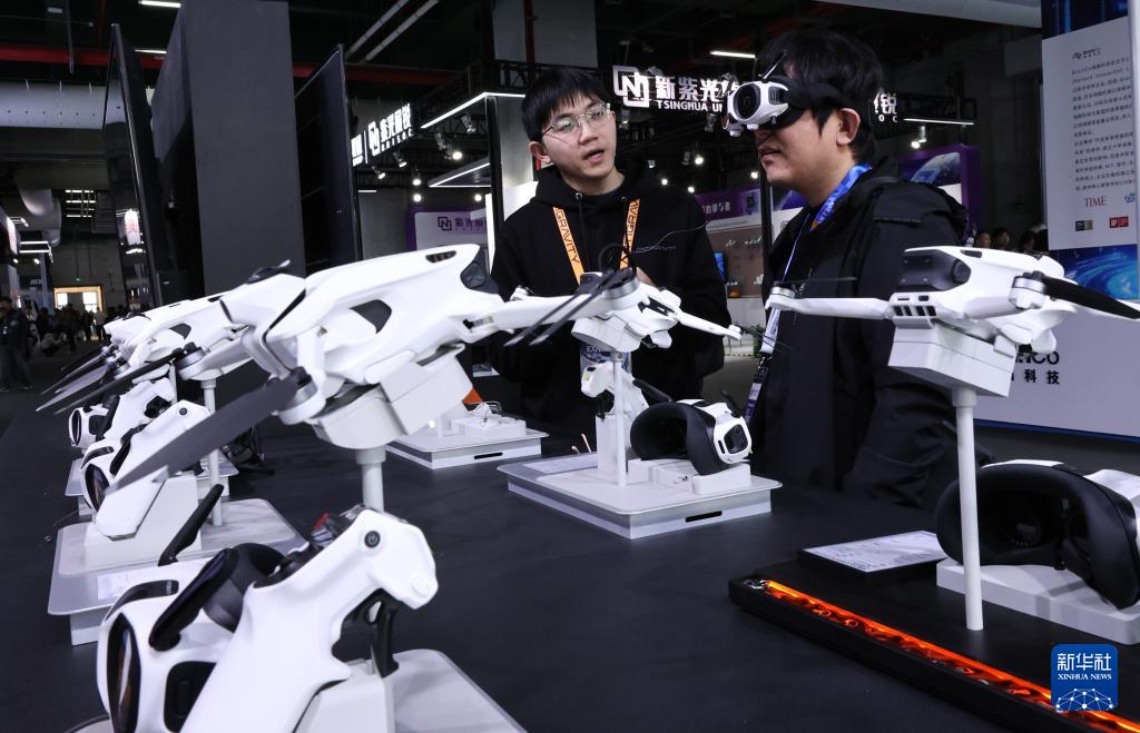3月12日,参观者(右)在东方枢纽展区现场佩戴智能眼罩体验全景飞行器视角。