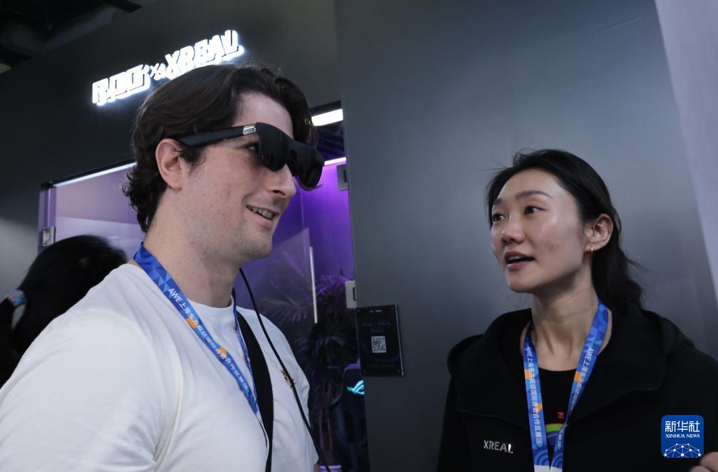3月12日,参观者(左)在东方枢纽展区现场体验一款智能眼镜产品。