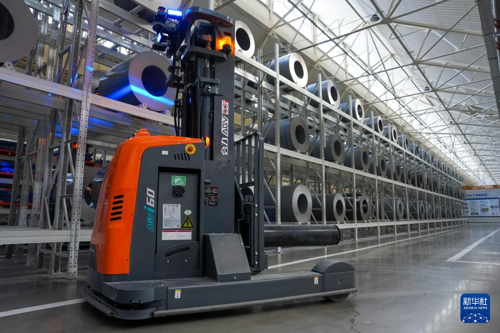 这是3月11日在哈电集团哈尔滨电机厂有限责任公司冲剪分厂数字化车间拍摄的正在运行的自动导向搬运车。