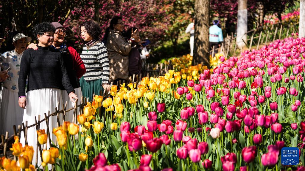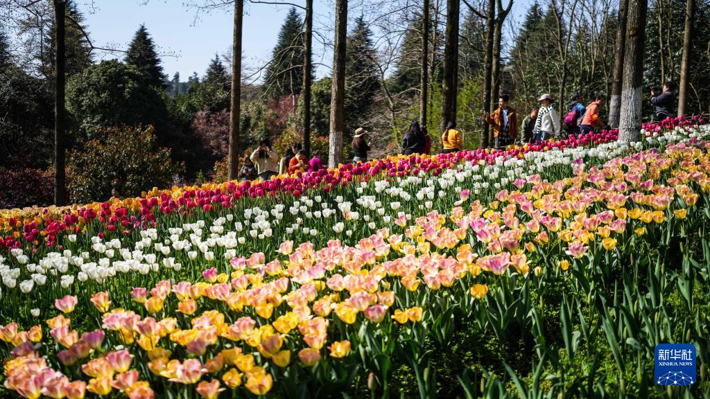 近日,贵州省黔南布依族苗族自治州龙里县龙架山国家森林公园内的数万株郁金香竞相绽放,吸引各地游客前来游玩赏景。