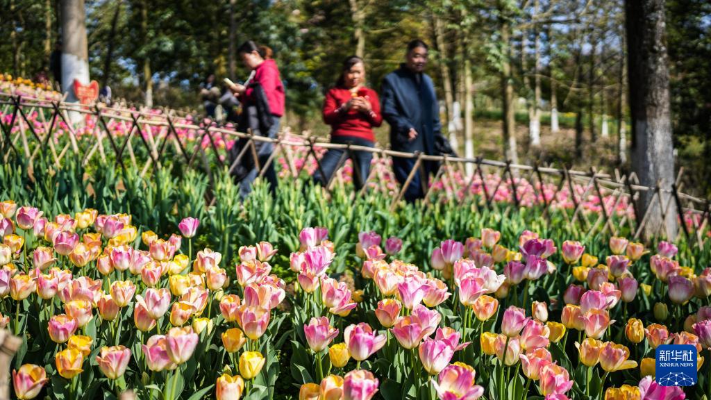 近日,贵州省黔南布依族苗族自治州龙里县龙架山国家森林公园内的数万株郁金香竞相绽放,吸引各地游客前来游玩赏景。