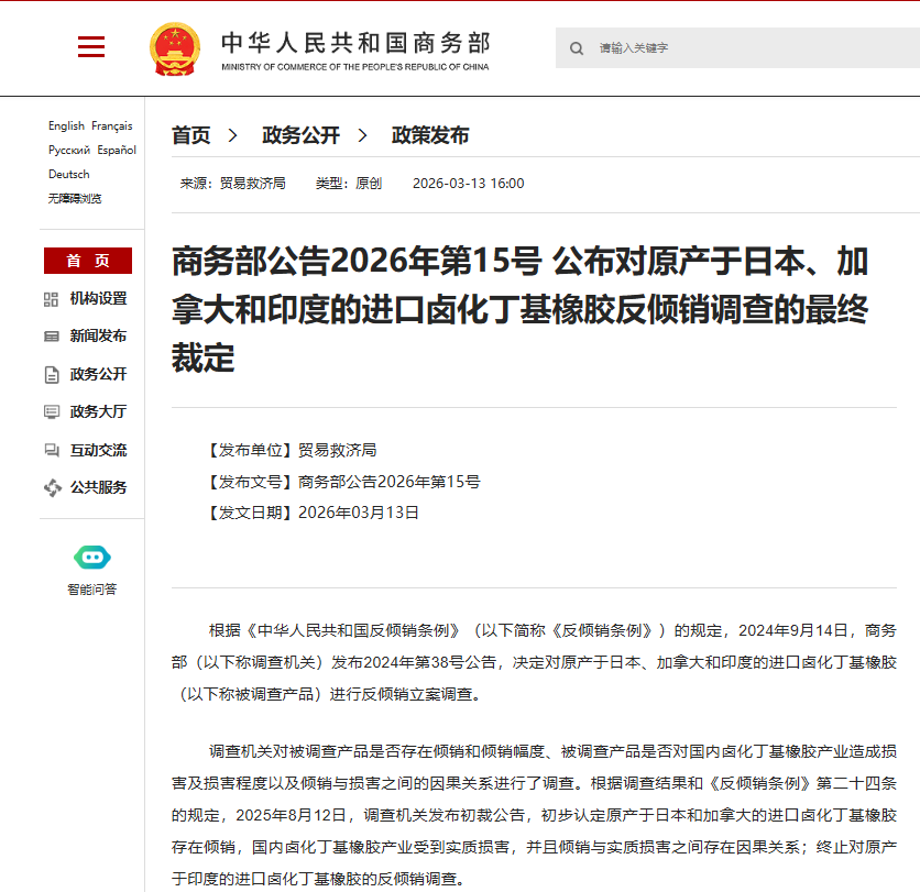 原标题:商务部公告2026年第15号 公布对原产于日本、加拿大和印度的进口卤化丁基橡胶反倾销调查的最终裁定