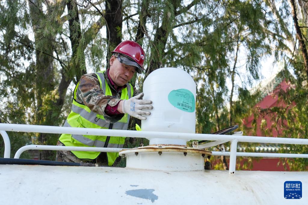 3月15日,在北京地坛公园,工作人员在向洒水车内添加花粉控制剂。