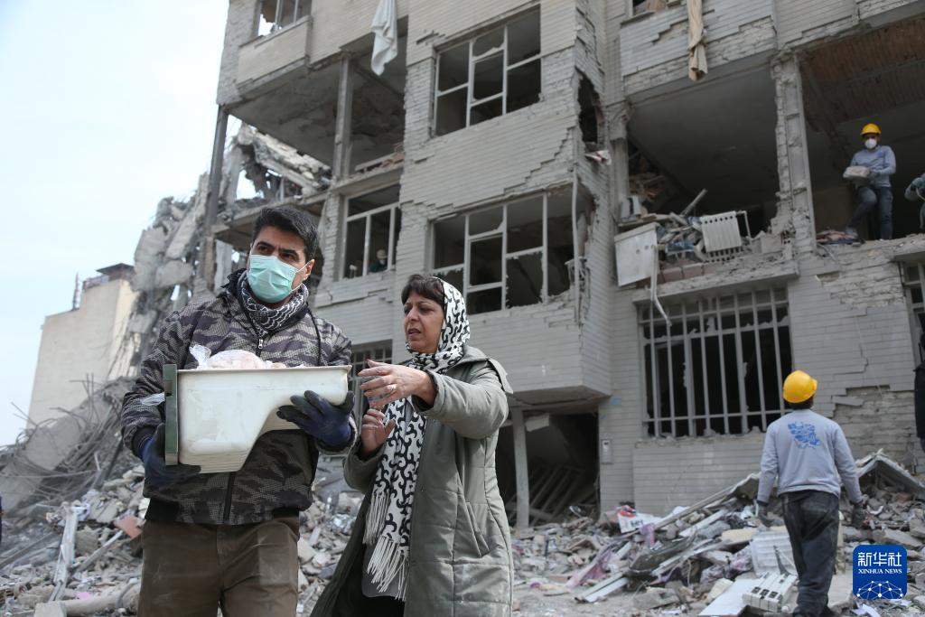 3月12日,在伊朗首都德黑兰,市民站在建筑废墟前。