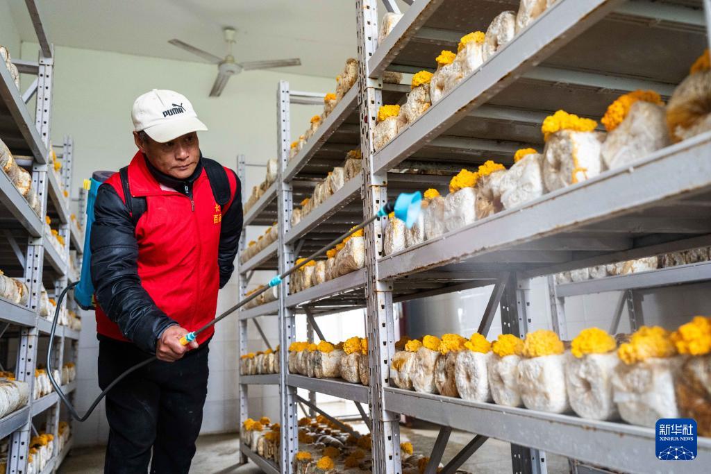 3月17日,在湖南省长沙市望城区靖港镇采丰蘑菇种植园,村民为金耳浇水。