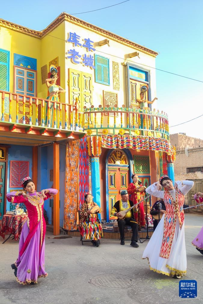 演艺人员在新疆库车市花帽巷表演(2025年11月10日摄)。新华社记者 关俏俏 摄