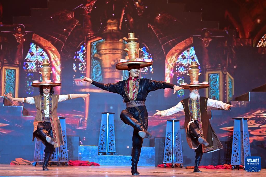 在新疆库车市大馕城,演员在大型沉浸式歌舞剧《杏花之约·丝路龟兹》中表演(2024年4月1日摄)。新华社记者 丁磊 摄
