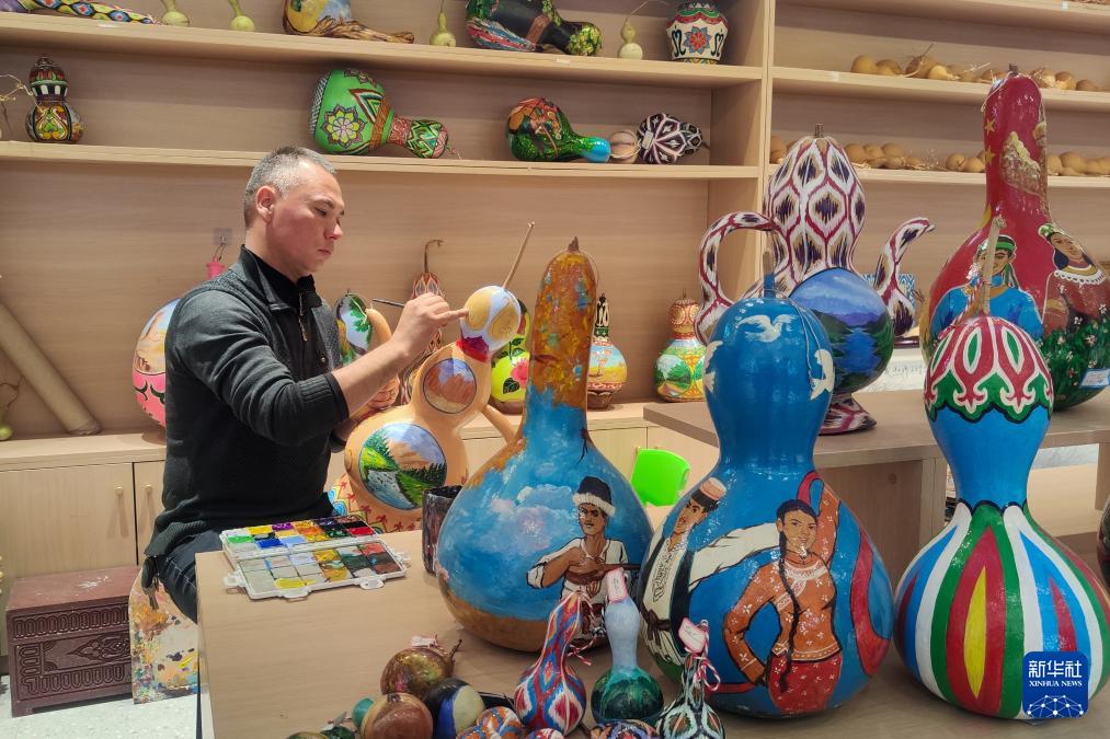 在新疆库车市龟兹非遗工坊,非遗传承人进行葫芦画制作(2025年11月10日摄)。新华社记者 关俏俏 摄