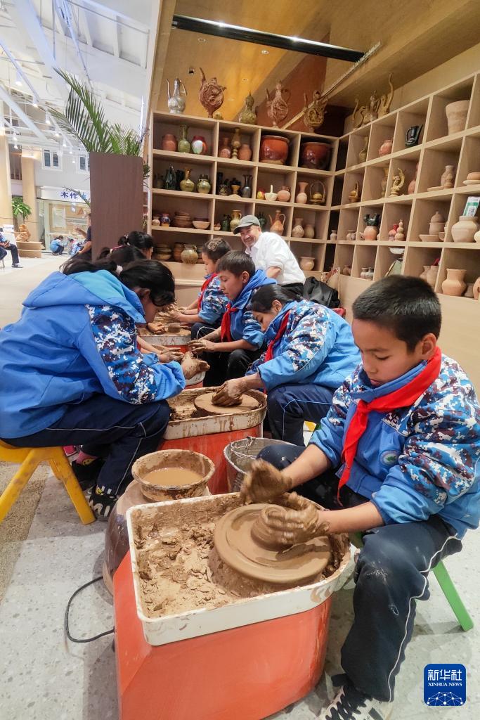 在新疆库车市龟兹非遗工坊,研学学生体验土陶制作(2025年11月10日摄)。新华社记者 关俏俏 摄