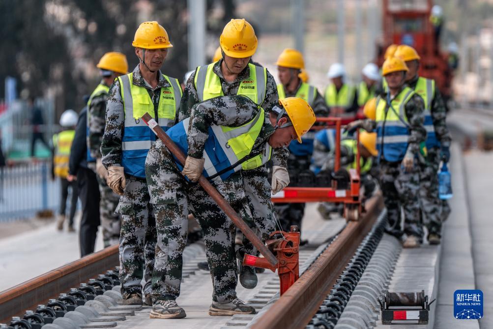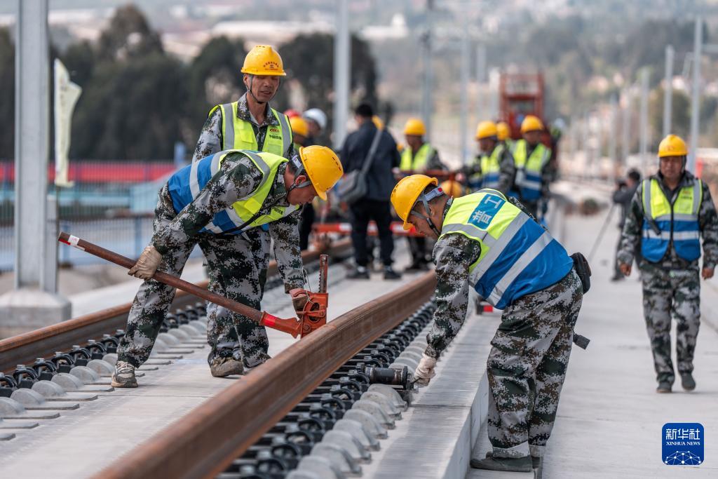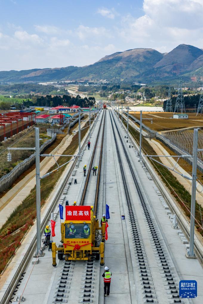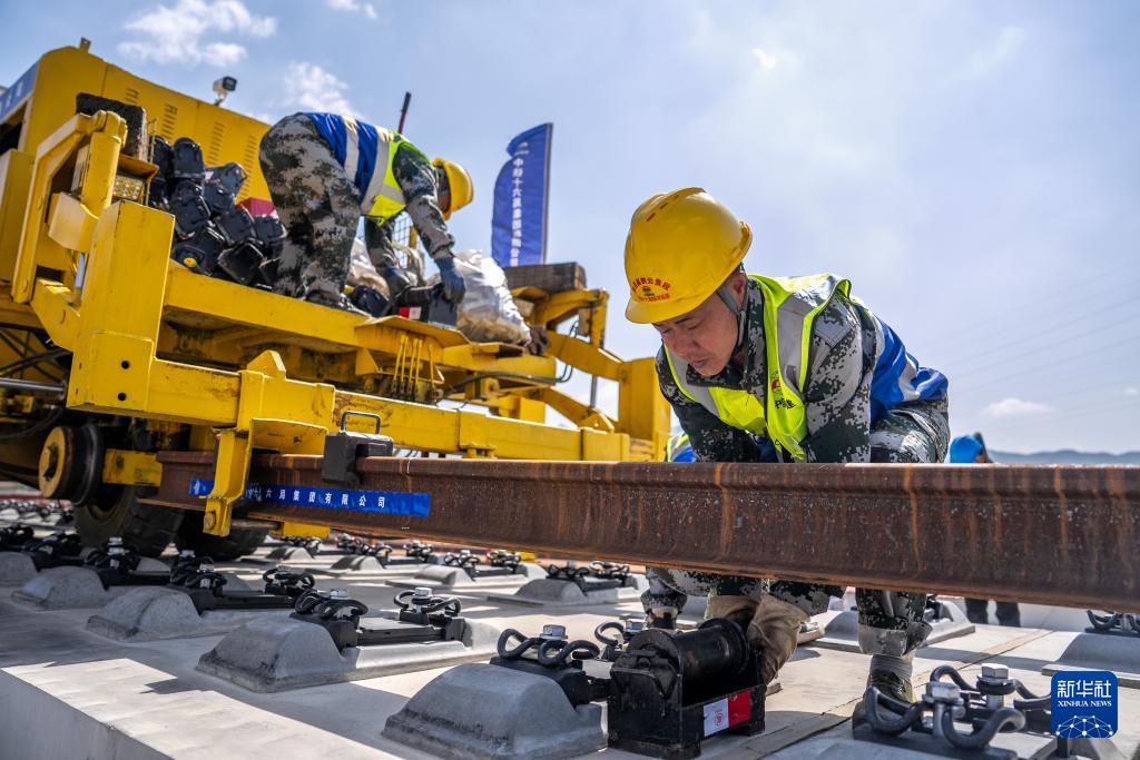 3月18日,工人在渝昆高铁施工现场进行铺轨作业。