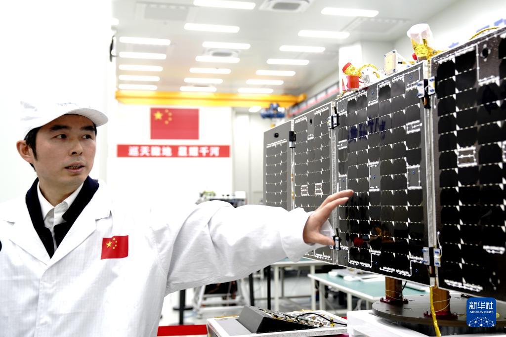 3月17日,上海巡天千河空间技术有限公司副总经理江炜介绍卫星太阳翼产品。