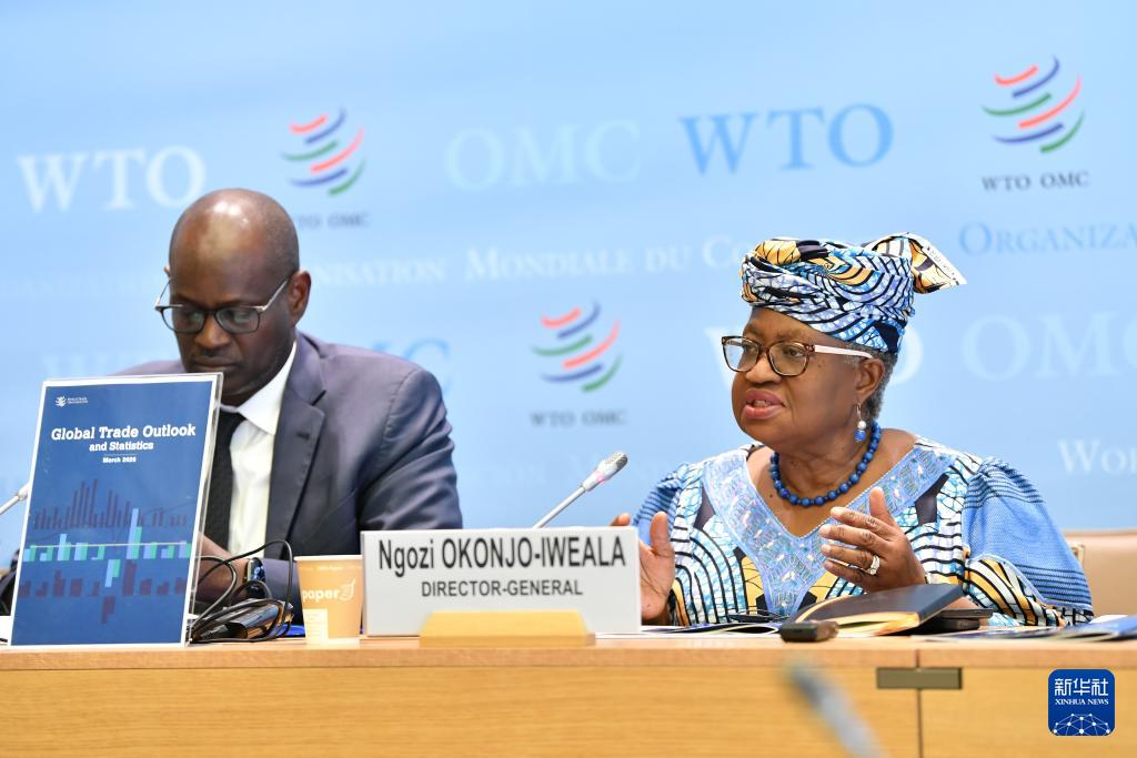 3月19日,在瑞士日内瓦世界贸易组织总部,世贸组织总干事伊维拉(右)在新闻发布会上讲话。新华社记者 连漪 摄