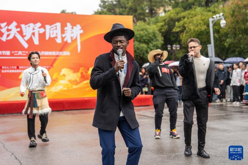 3月19日,湖南农业大学留学生在农耕体育文化活动中唱歌。