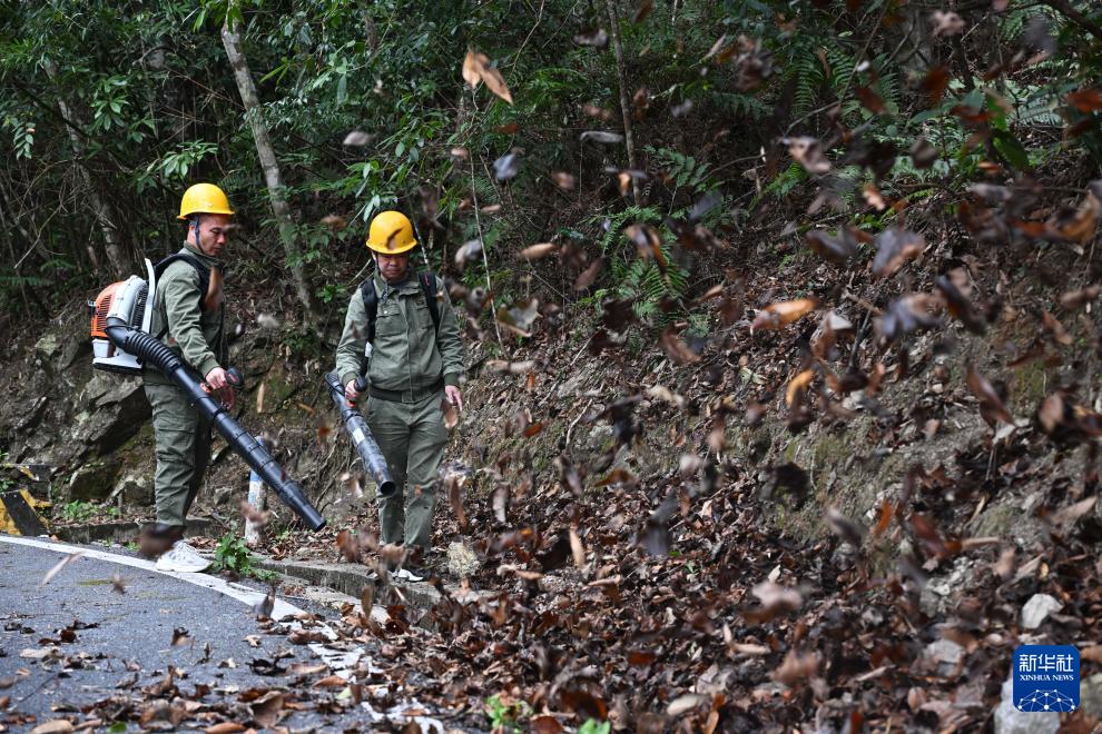 3月17日,广东省乳阳林场八宝山管护站护林员张小平(左)、王朝阳在巡山途中清理堆积的枯枝落叶。