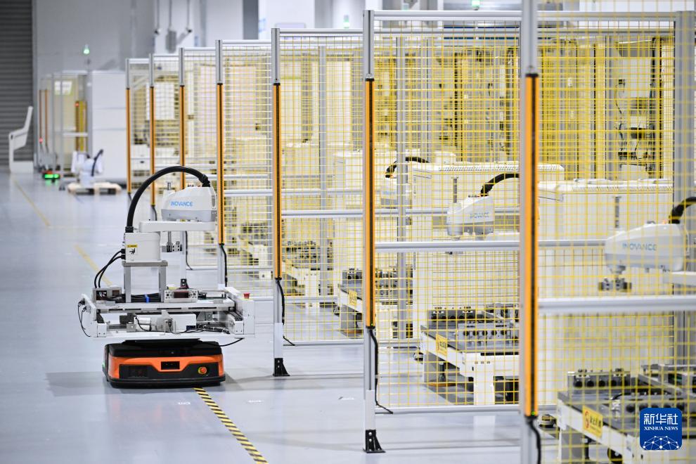 3月17日,在位于南京市江宁开发区的汇川技术南京基地自动化车间内,AGV小车在搬运完成测试的机器人。