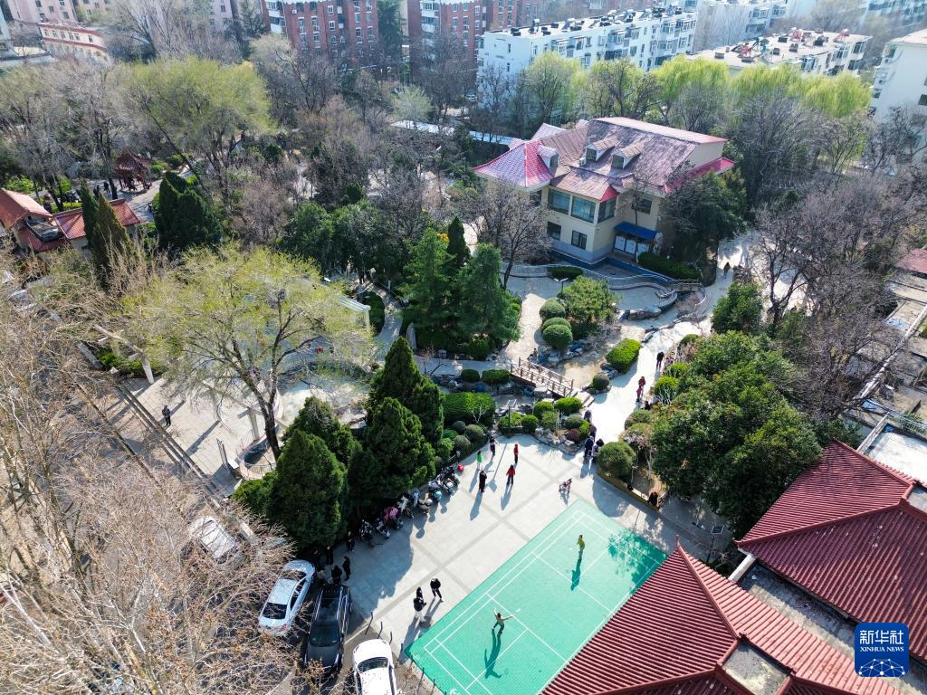济南市历下区燕子山中区社区内,居民在升级后的“口袋公园”内参加健身活动(3月19日摄,无人机照片)。