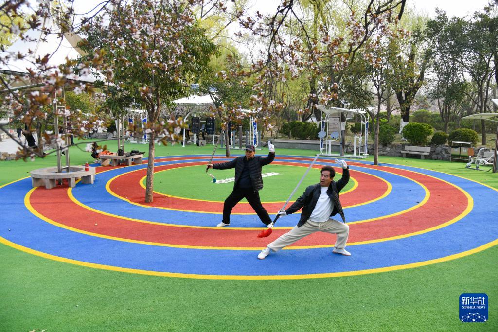 济南泉城公园内,健身爱好者在全龄智能健身区练习太极剑(3月22日摄)。