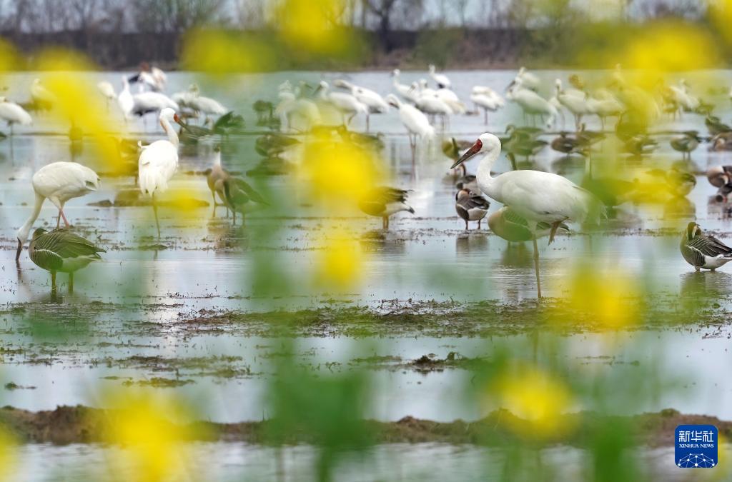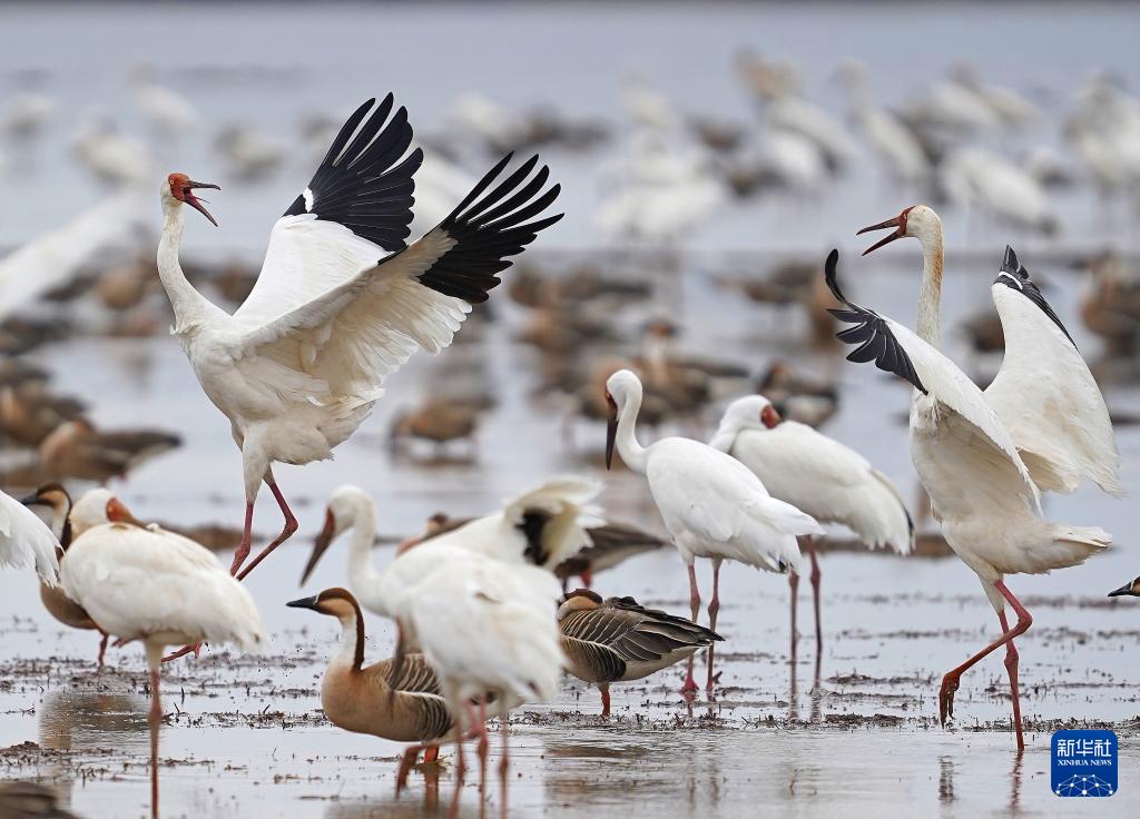 白鹤等候鸟在鄱阳湖畔的江西省余干县白鹤洲栖息(2026年2月27日摄)。