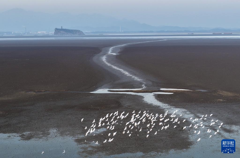 候鸟在江西省湖口县鄱阳湖鞋山水域栖息(无人机照片,2025年11月27日摄)。