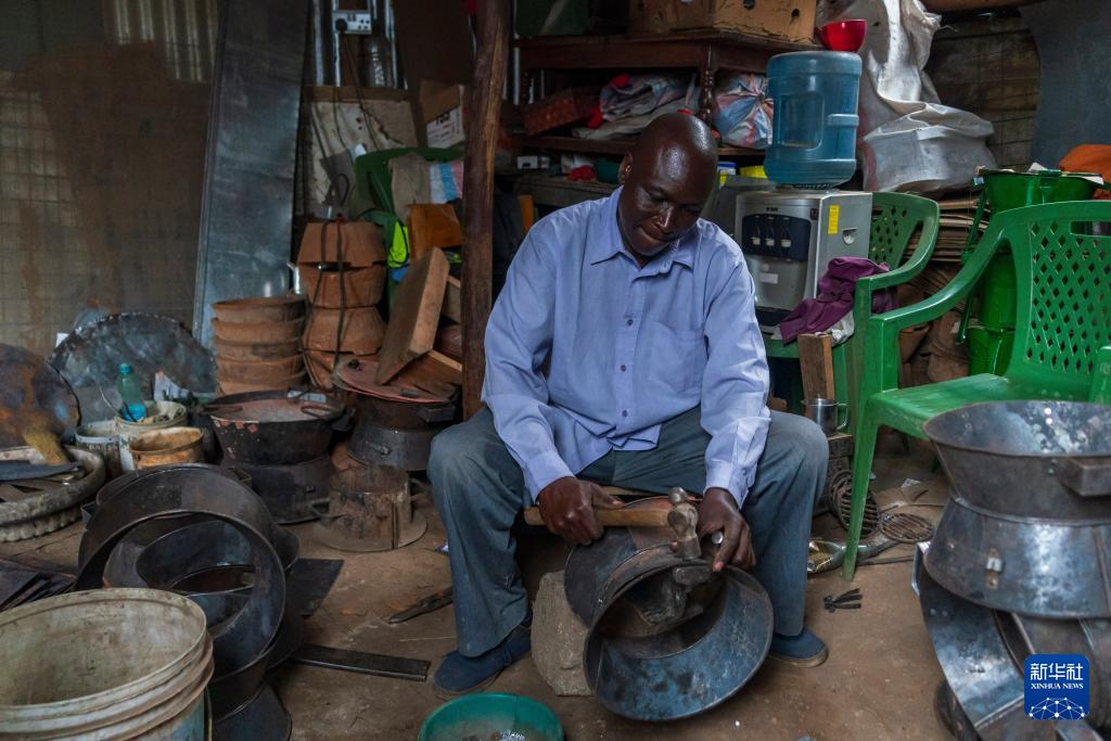 在维多利亚湖畔的肯尼亚基苏木,商家制作陶土炉灶的金属外壳(2026年2月28日摄)。这种清洁炉灶的制作原料取自非洲当地,工艺简单,在市场上出售还能增加收入。