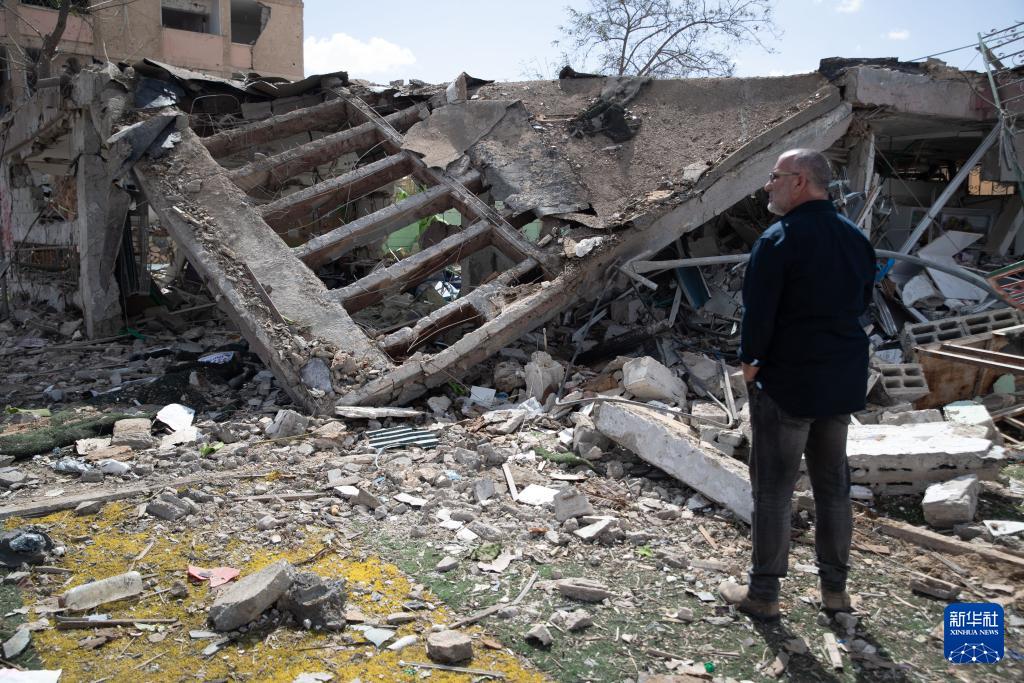 3月22日,在以色列南部城市迪莫纳,一名男子查看在导弹袭击中损毁的建筑。