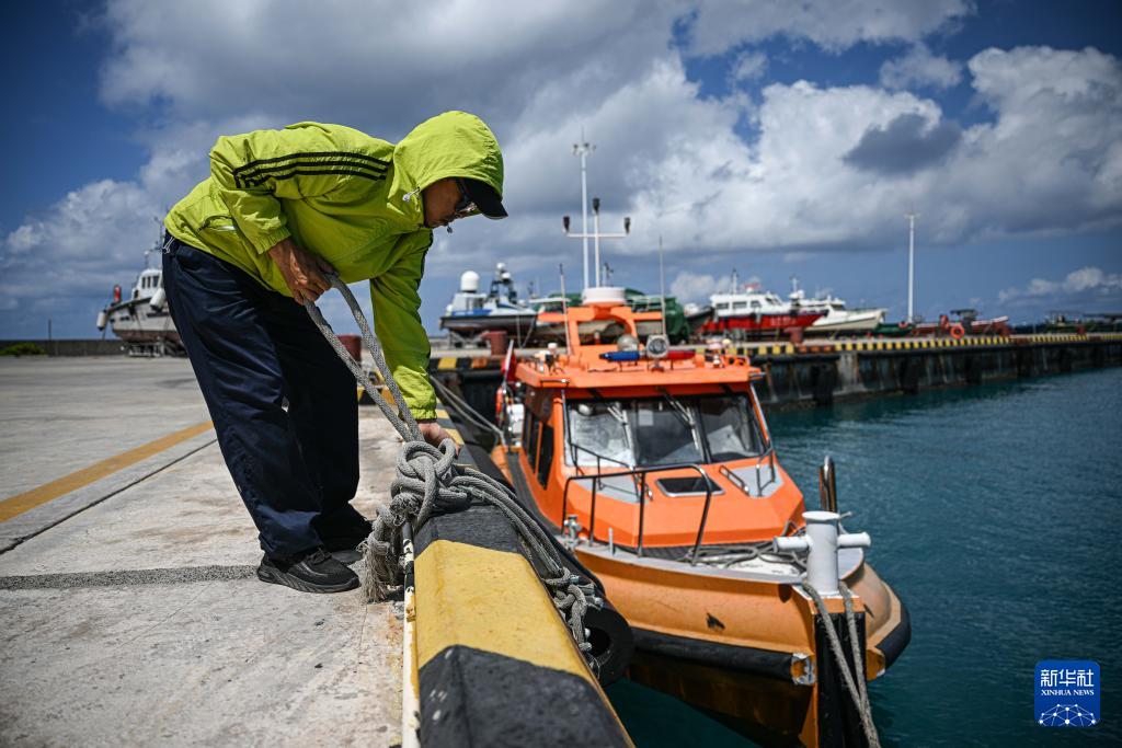 3月19日,在海上交通保障船抵达海南三沙永兴岛码头后,工作人员整理缆绳准备固定船只。