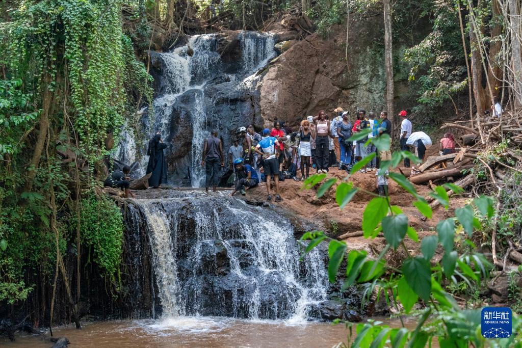 1月25日,在肯尼亚首都内罗毕,人们在卡鲁拉森林中的一处瀑布前休闲。
