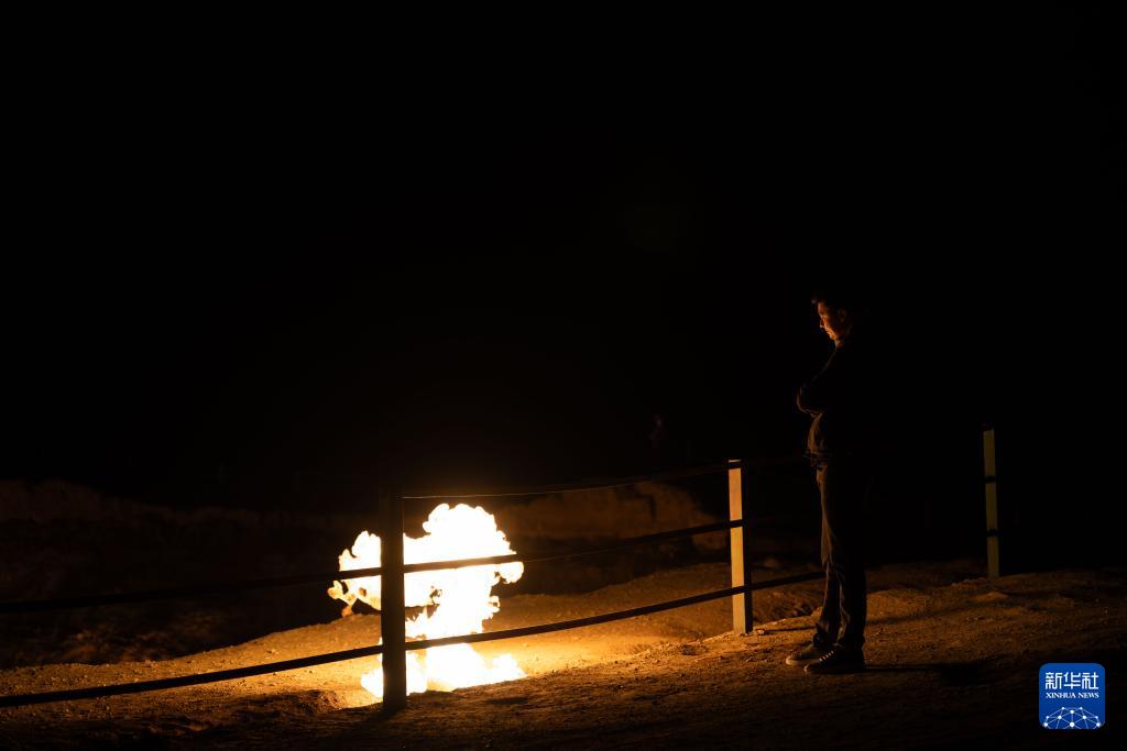 3月19日晚,一名男子在土库曼斯坦达瓦扎天然气坑游览。