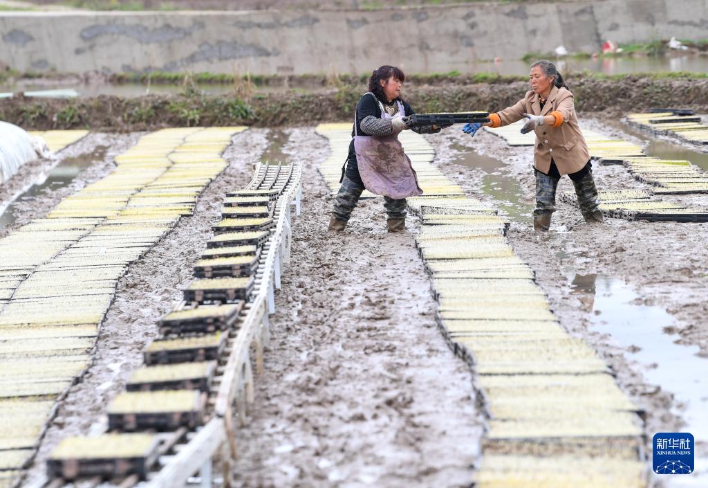 3月24日,农民通过机械传送带将水稻育秧盘运送到田里。