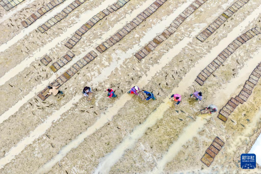 3月24日,农民在田间摆放水稻育秧盘(无人机照片)。