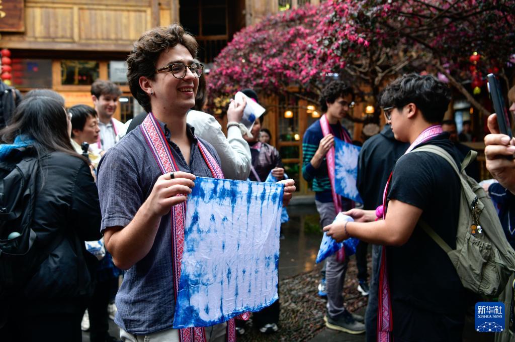 3月23日,在贵州省黎平县肇兴侗寨,一名美国耶鲁大学威芬普夫斯阿卡贝拉合唱团的成员展示亲手染制的蜡染作品。