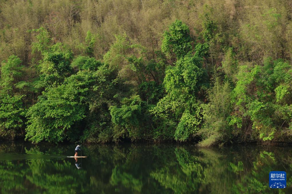 3月14日,一名游客在泰国北碧府爱侣湾国家公园划桨板。