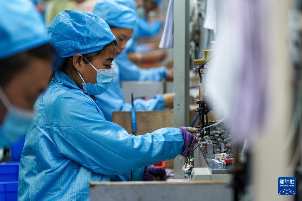 3月25日,工人在以礼街道一家电子企业生产车间流水线上作业。