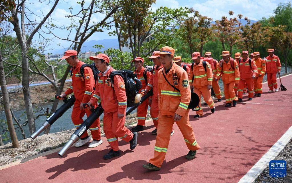 3月25日,高光原(前右)和其他灵活就业人员在进行辅助灭火训练。高光原居住在金钟街道松山村,移居以礼社区后,打零工之余还担任一些社区服务工作获得报酬。