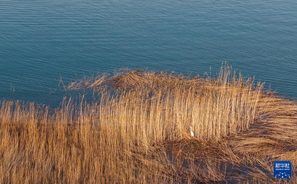 3月25日,一只白鹭在乌海湖觅食(无人机照片)。