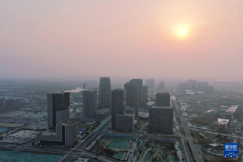 这是3月27日在雄安新区拍摄的日出(无人机照片)。