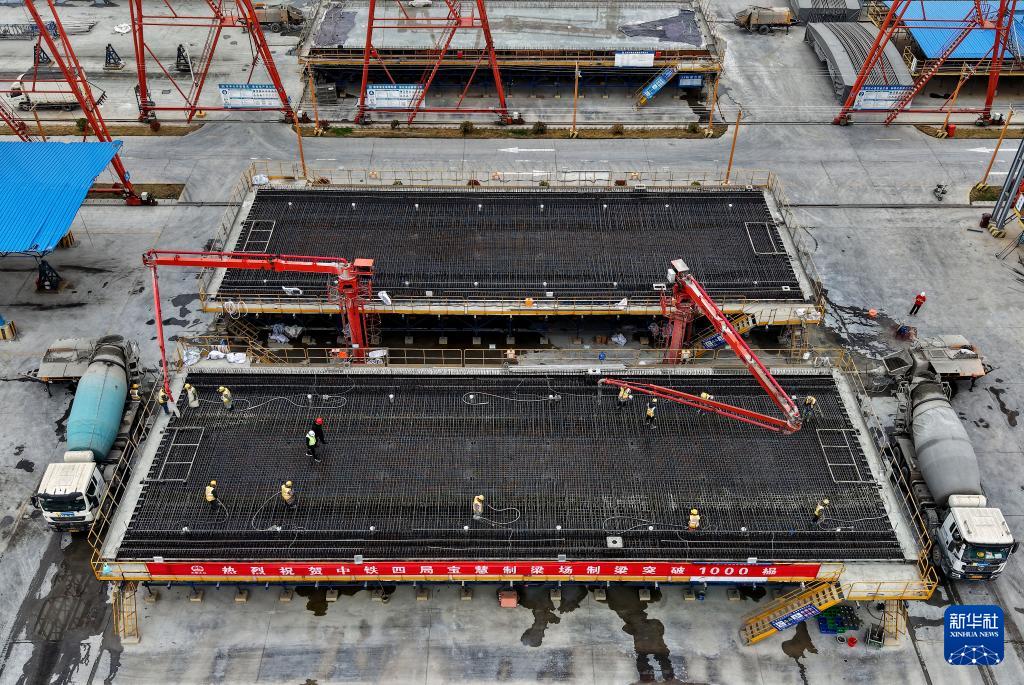 3月26日,空中俯瞰中铁四局宝慧制梁场1000榀箱梁浇筑施工现场(无人机照片)。