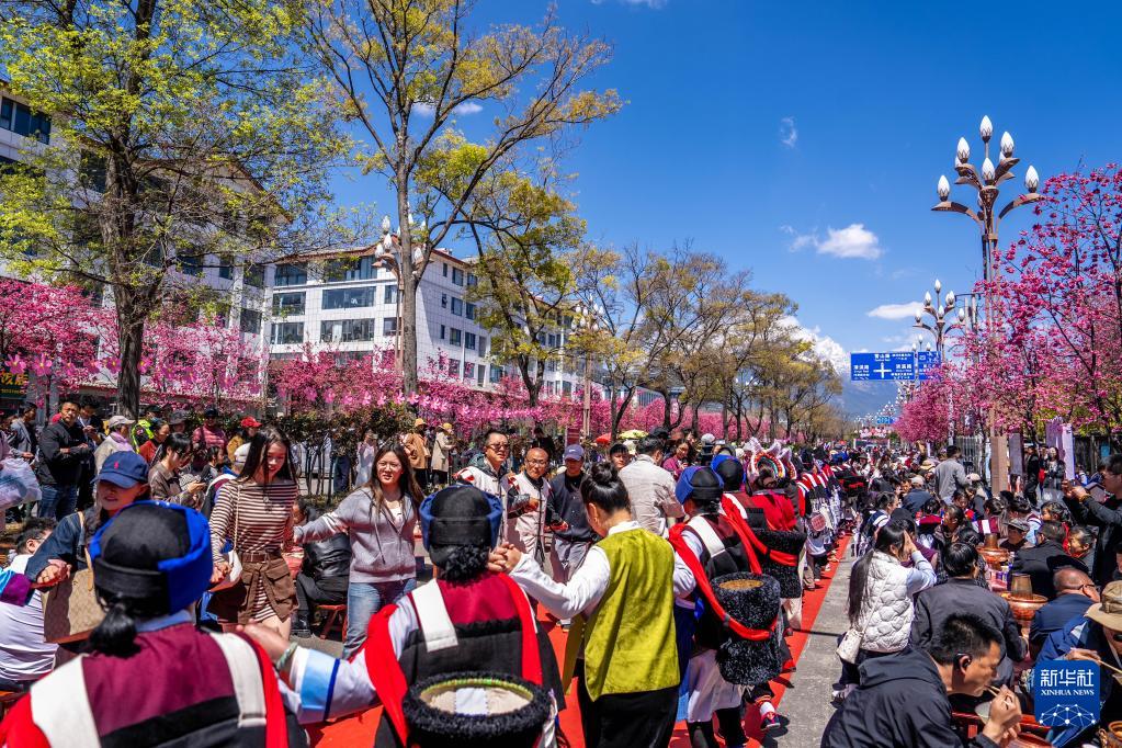 3月26日,人们在丽江市雪山路长街宴活动现场品尝美食。
